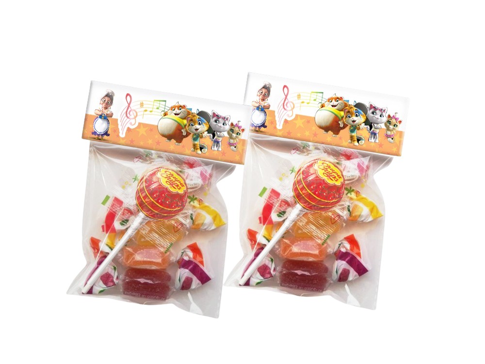 Bustina di caramelle e lecca lecca. Ogni bustina contiene un lecca lecca e 4 caramelle.