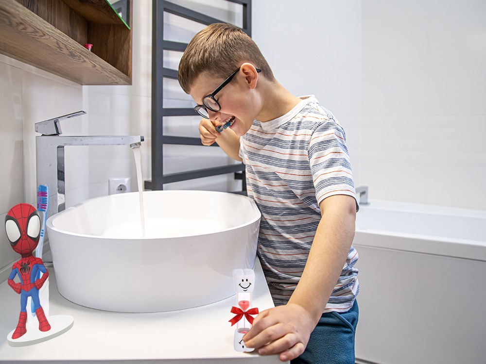 La clessidra è rappresentata con un viso sorridente, con la sabbia colorata adatta ai bambini che segnerà i minuti sufficienti per lavarsi i denti, così il tuo/a bambino/a sarà contento di lavarseli.