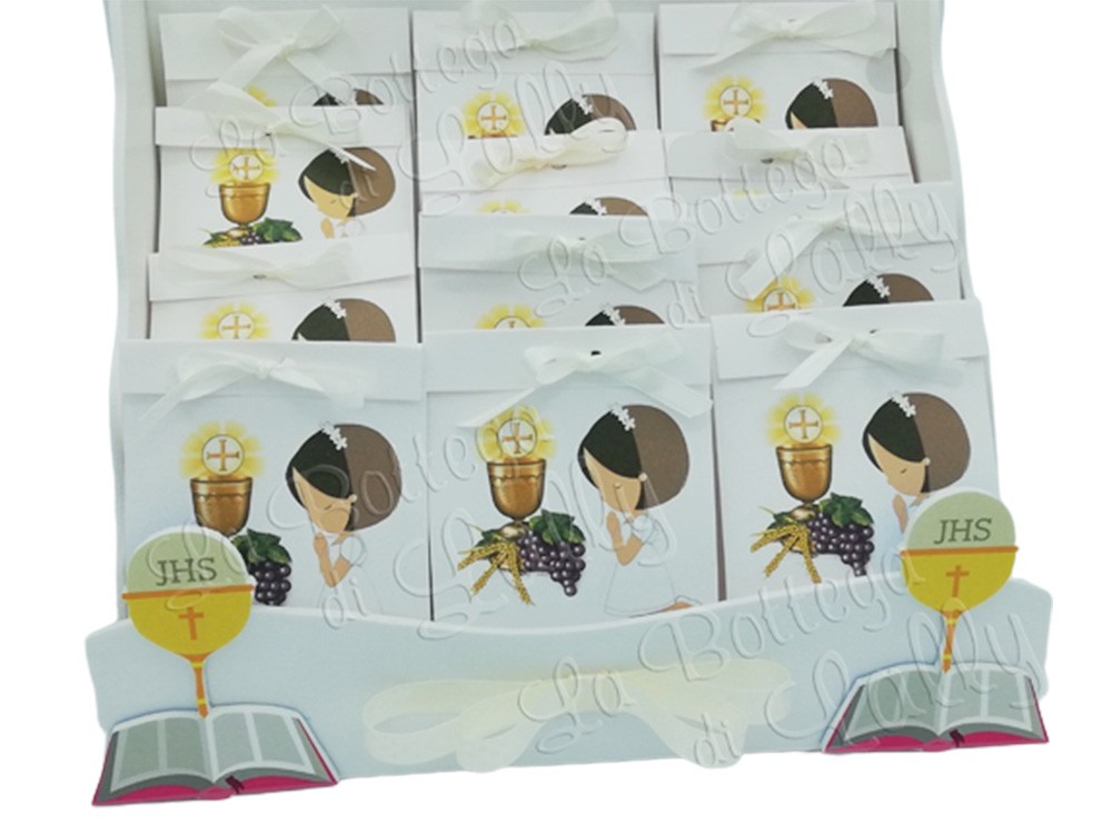 Si realizzano espositori con i sacchettini e confetti per Comunione.