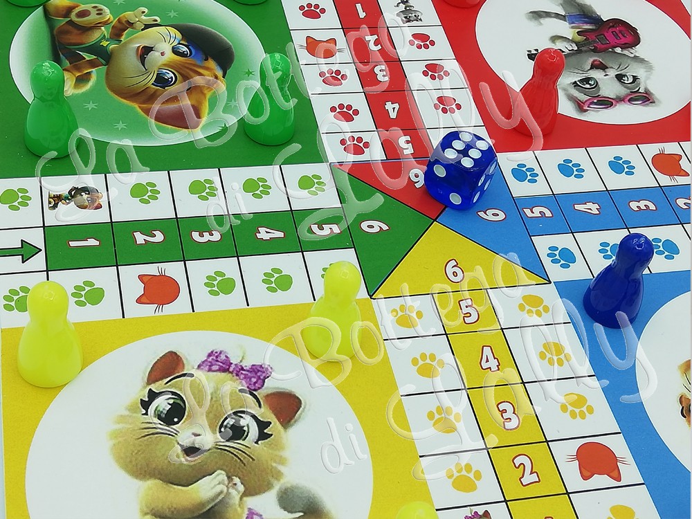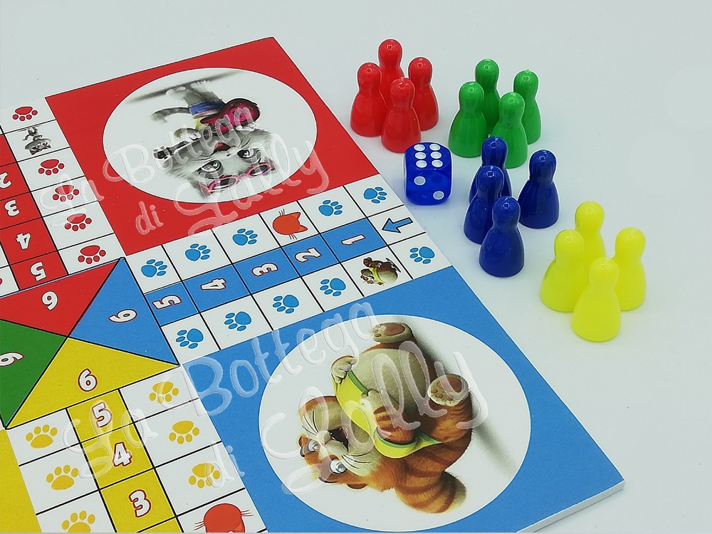 Contiene la base del gioco, 4 pedine, un dado e le istruzioni.