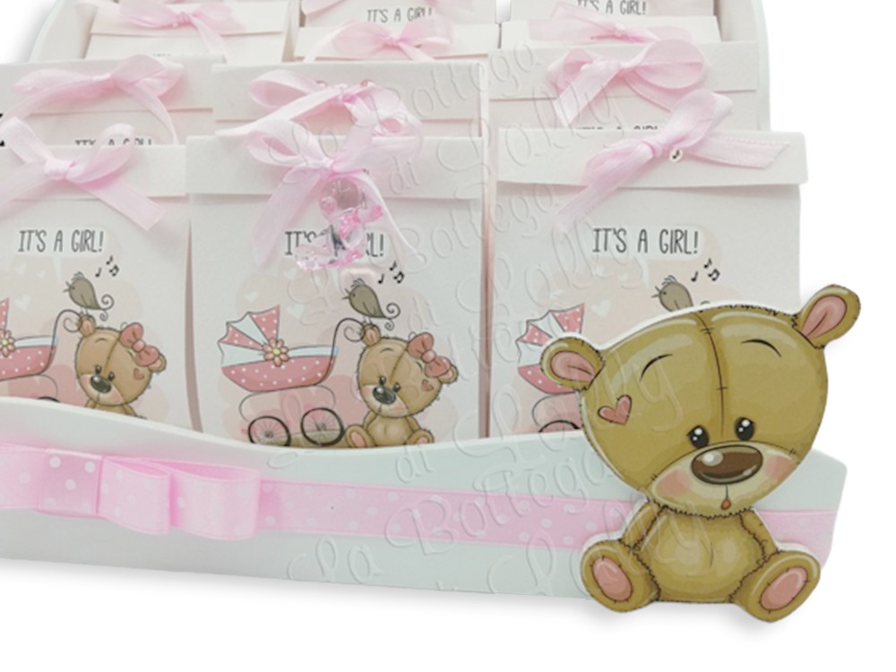 Si realizzano espositori con i sacchettini e confetti per Battesimo o Nascita.